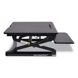 These lifting workstations turn any desk into an ergonomic sit-stand station. Raise and lower with ease. Two-tiered worksurface and keyboard/mouse platform for better ergonomics. Platform’s rear-notched design accommodates most monitor arms. Neatly route cables behind display. Designed specifically for use with the Alera® Monitor Arms. Smart space-saving design stays within your desk space and raises vertically within the same plane. No having to step back and out when in the raised position. Reinforced base for stability at any height. Will not flip or height-drop even when leaning on the workstation.