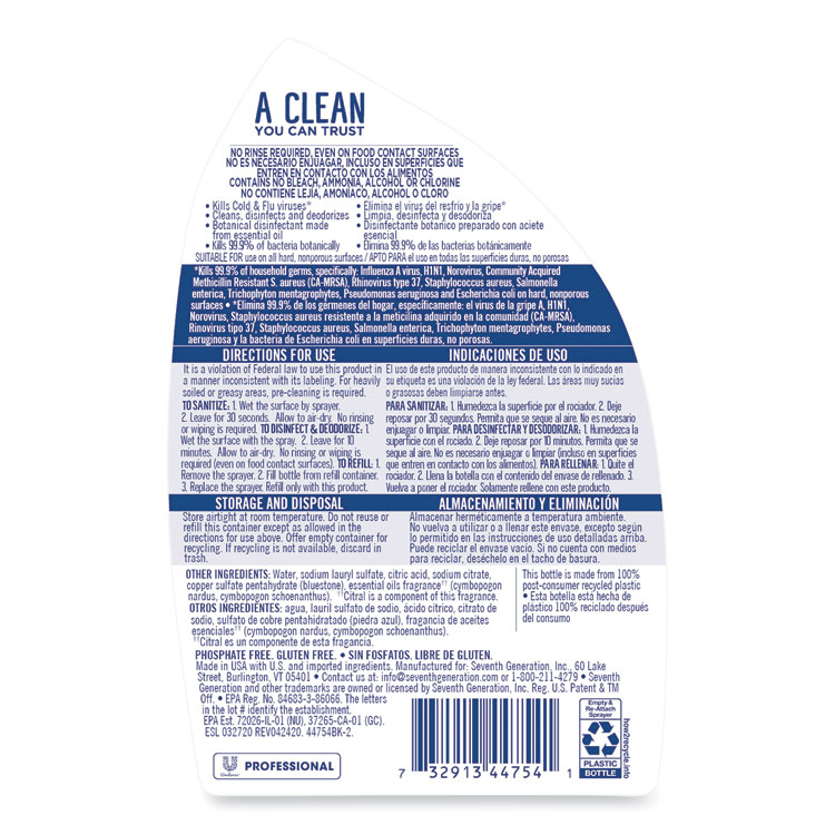 Kills 99.9% of household germs botanically, specifically Influenza A virus, H1N1, Norovirus, Methicillin-resistant S. aureus (MRSA), Rhinovirus type 37 (the Common Cold virus), Staphylococcus aureus, Salmonella enterica, Trichophyton mentagrophytes, Pseudomonas aeruginosa and Escherichia coli on hard, nonporous surfaces. Cleans, disinfects and deodorizes. No rinsing or wiping required. Deodorizes and effectively controls odors. EPA List N disinfectant for Coronavirus (COVID-19 Virus). EPA Registration No. 84683-3-86066. Made with CleanWell® proprietary botanical disinfecting technology. Clean and disinfect in one easy step. Bottle is made with 80% Post-Consumer Recycled (PCR) plastic.