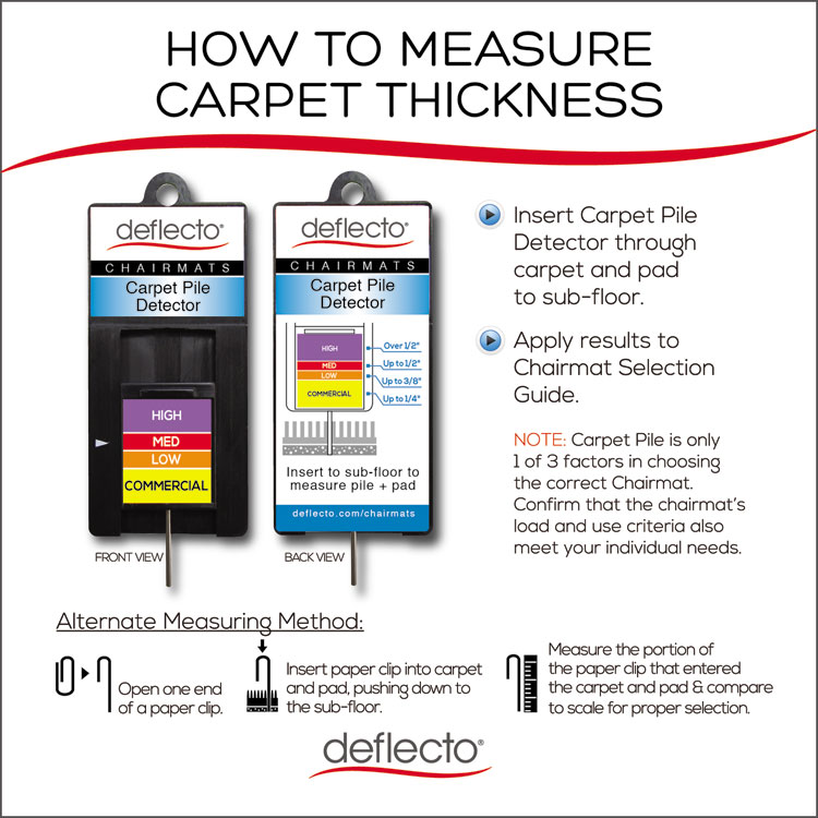 - For occasional office use on carpets up to 1/4″ thick, Low Pile/Commercial Grade. Choose a higher pile chairmat if daily usage is over 4 hours.