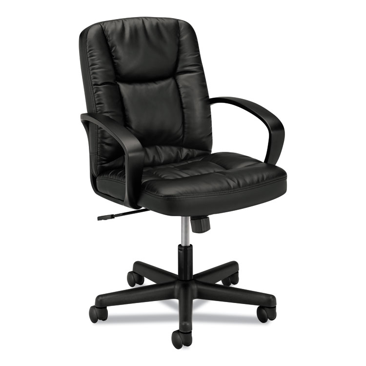 Practicality and professionalism combined. Plush black bonded leather upholstery for comfort and style. Five-star base with casters for easy mobility.