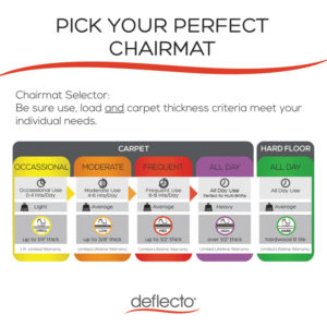 Thinner mat provides a great value while offering economical performance. Lightweight chair mat for occasional use on carpets up to 1/4″ thick. Easy-glide rolling surface provides effortless chair movement. Studded design secures mat from moving while protecting carpet from caster wear, spills and heavy traffic. Free and Clear® non-orthophthalate, non-cadmium formula promotes a healthy work environment while offering exceptional clarity and durability. Classic straight edge finish.