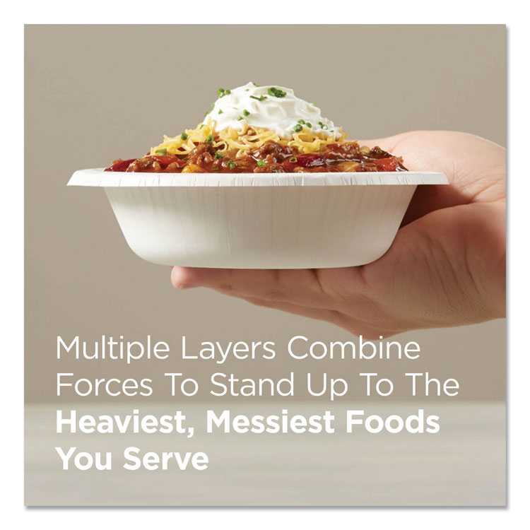Moisture resistance, grease resistance and dry and wet rigidity make Dixie Ultra® Heavy-Weight Paper Bowls the right choice for the heaviest, messiest foods you serve. The unique structure and multi-layer coatings give these disposable paper bowls their strength, while the Soak-Proof Shield™ helps keep moisture and grease from leaking through. The Pathways® design matches other Dixie Ultra® plates, platters, bowls and cups to create an attractive, coordinated look. These heavy-duty paper bowls are ideal for foodservice and special events, and because they’re microwaveable and cut-resistant, these small paper bowls come in handy in kitchens and breakrooms.