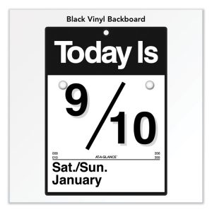 A calendar is a necessity in every workspace, and this dependable classic makes it easy to keep track of each day, one day at a time. Each sheet boldly displays either a single weekday or the weekend (with Saturday and Sunday combined). Extra-large black print on a bright white background delivers a high-contrast effect to help ensure just about anyone can check the date at a glance. Rigid, black vinyl backboard with eyelet simplifies hanging the calendar on cubical panels, room dividers, sheet-rock walls, plaster walls and more. Yearly refills available—use the handy backboard year after year.